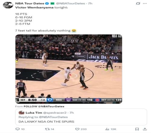 這場比賽馬刺慘敗的罪人就是核心維克托-文班亞馬,他作為一名身高7尺4寸(裸足達(dá)到2.24米)的內(nèi)線,他在面對奎因、瑪特科維奇、錫安時(shí)打不到內(nèi)線,他更是被胖虎各種頂著上籃,文班亞馬的身體對抗差到極致。