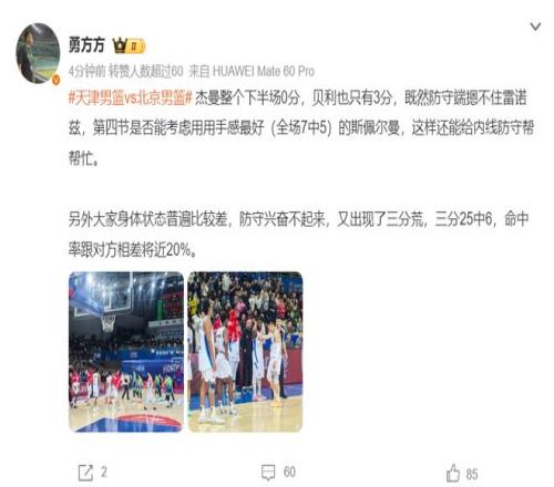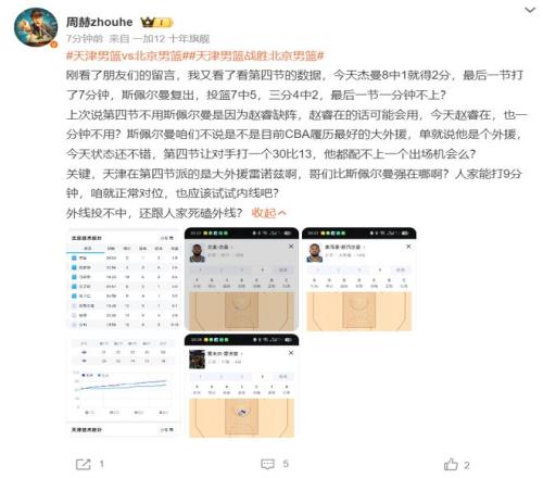 媒體人周赫對北京這場失利非常不滿,他認為末節(jié)該棄用的是8中1的杰曼而非斯佩爾曼,因為末節(jié)天津是用雷諾茲,北京這邊應(yīng)該讓斯佩爾曼上去限制他的發(fā)揮。
