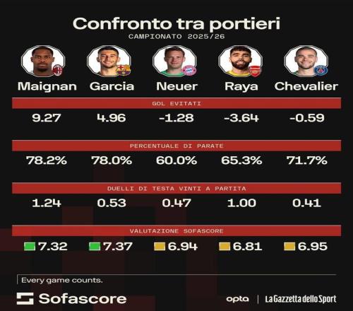 25/26賽季,米蘭一門邁尼昂狀態(tài)明顯復(fù)蘇,多次在關(guān)鍵比賽中力挽狂瀾。據(jù)專業(yè)機構(gòu)統(tǒng)計,法國國門的實際失球數(shù)要比預(yù)期失球數(shù)少9.27個,該項數(shù)據(jù)排名歐洲五大聯(lián)賽第1位。好消息是,米蘭即將以隊內(nèi)頂薪與其續(xù)約至2031年。
