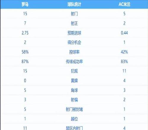 羅馬隊(duì)在多項(xiàng)數(shù)據(jù)上占據(jù)優(yōu)勢,他們的射門次數(shù)為15次,射正7次,而AC米蘭這兩項(xiàng)數(shù)據(jù)分別為5次和2次,羅馬隊(duì)的控球率接近六成,并獲得5個(gè)角球。
