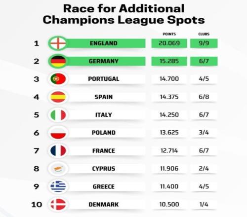 歐冠聯(lián)賽階段賽場結(jié)束,以下為本賽季目前各聯(lián)賽歐戰(zhàn)系數(shù)(前2名獲額外歐冠名額):