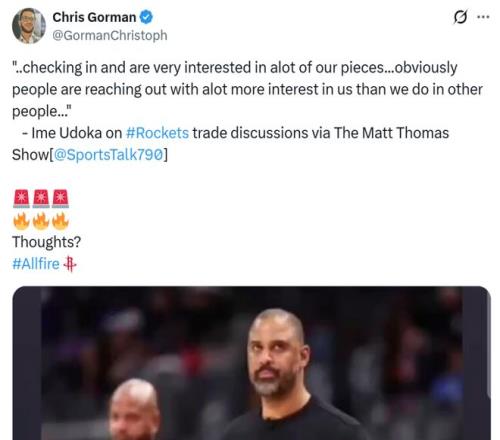 烏度卡表示內(nèi)部正在討論這一話題,電話的確一直響個不停,相比火箭主動聯(lián)系其他球隊,近期聯(lián)系火箭詢問潛在交易的其他球隊明顯更多。