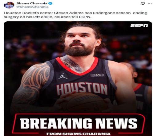消息最先由ESPN名記Shams曝出,亞當(dāng)斯左腳踝接受手術(shù),確定賽季報銷。隨后火箭隊官方確認(rèn)消息真實性。