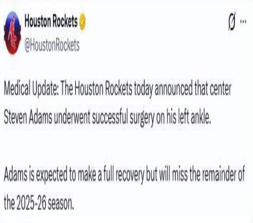 北京時間1月29日,據(jù)ESPN記者Shams報道,火箭隊中鋒史蒂文-亞當(dāng)斯因左腳踝傷勢接受手術(shù),將缺席2025-26賽季剩余全部比賽。隨后,火箭官方宣布了這一消息。亞當(dāng)斯本人曬出術(shù)后病床照:一切都很順利,感謝你們所有的關(guān)心和祈禱。