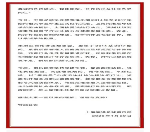 附上海申花、上海海港俱樂部公告: