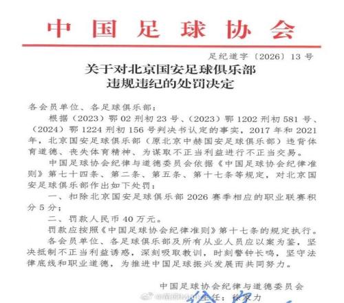 周四,中國足協(xié)正式公布受處罰俱樂部名單。北京國安被罰5分、罰款40萬,博主清蒸樹袋熊質(zhì)疑道,“咱不能揣著明白裝糊涂”。