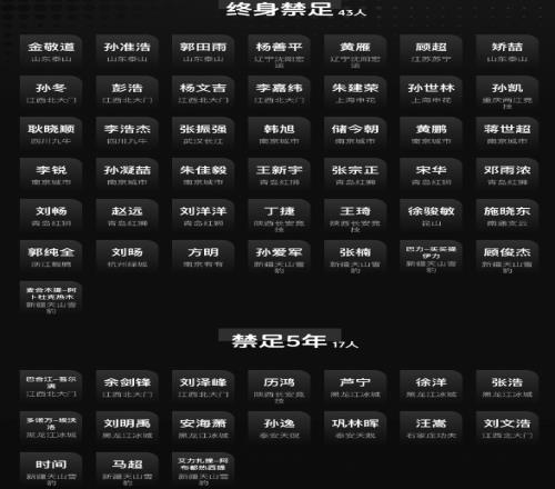 隨后,足協(xié)首次公布處罰名單,包括金敬道、孫準(zhǔn)浩、郭田雨、矯喆、朱建榮、孫士林在內(nèi)的43人被終身禁足,包括汪嵩在內(nèi)的17人被禁足5年。