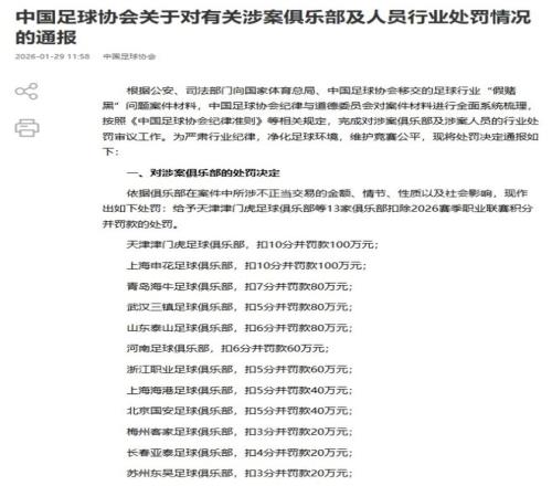 北京時(shí)間1月29日,中國(guó)足協(xié)公布“假賭黑”專項(xiàng)整治行動(dòng)處罰結(jié)果,球員方面,包括李鐵、陳戌源在內(nèi),一共73人被終身禁足。俱樂(lè)部方面,中超、中甲,累計(jì)13家俱樂(lè)部遭扣分+罰款處罰,其中新賽季的4大爭(zhēng)冠球隊(duì)也沒(méi)能幸免,全部被扣分。僅蓉城隊(duì)沒(méi)有卷入其中。