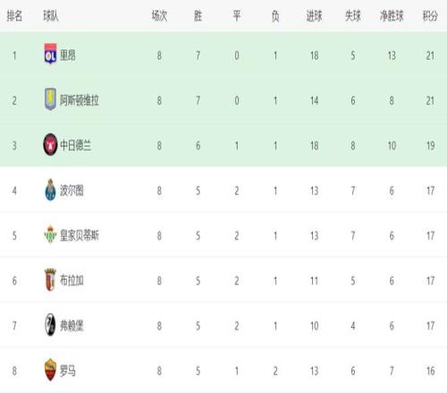 至此,歐聯(lián)杯16強已經(jīng)決出8個名額,排名前8的球隊直接晉級,包括:里昂、阿斯頓維拉、中日德蘭、波爾圖、皇家貝蒂斯、布拉加、弗賴堡和羅馬。