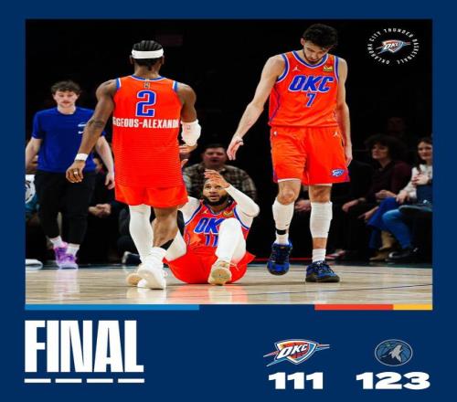 杰林威廉姆斯轟進(jìn)三分球,愛德華茲2罰全中,多爾特失誤,愛德華茲單打多爾特中投得分,森林狼重新取得20分領(lǐng)先。亞歷山大快速上籃取分,戈貝爾補(bǔ)籃打進(jìn),距離終場僅剩4分09秒,戴格諾特請求暫停并換上板凳席末端的球員,選擇提前認(rèn)輸,比賽就此失去了懸念。愛德華茲拋投命中,芬奇也換下了首發(fā),兩隊開始在場上練兵,比賽時間逐漸走完。最終,森林狼以123比111完勝雷霆。