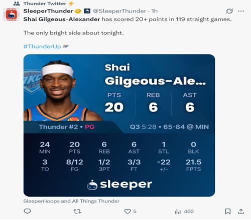 這場比賽SGA延續(xù)了連續(xù)119場20+的紀(jì)錄,他距離張伯倫連續(xù)126場20+的紀(jì)錄只差7場,這場比賽SGA真的是被迫背鍋的。