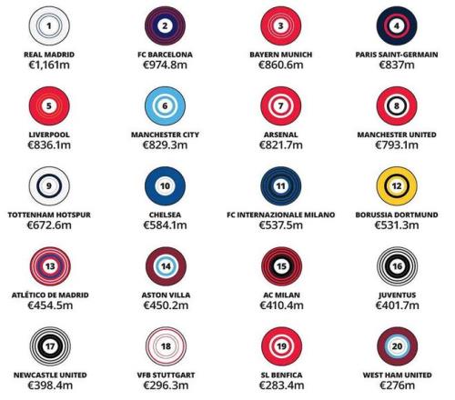 1、皇家馬德里(Real Madrid) 西班牙 11.61億歐元/+11%
