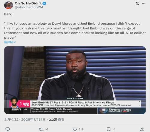 看看恩比德最近的數(shù)據(jù),你就知道帕金斯為啥要道歉了。過(guò)去6場(chǎng)比賽,恩比德有5場(chǎng)砍下30+!最近4場(chǎng)比賽,恩比德場(chǎng)均34分10籃板7助攻,投籃命中率55%,三分命中率43%。最近6場(chǎng)比賽,恩比德場(chǎng)均33.2分9籃板5.8助攻!