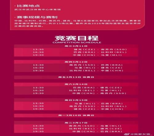 中國女籃將坐鎮(zhèn)主場在武漢參加世預(yù)賽,如今武漢賽區(qū)公布具體競賽日程。中國女籃將從3月11日到17日,7天之內(nèi)先后對陣馬里女籃、比利時女籃、南蘇丹女籃、捷克女籃和巴西女籃。
