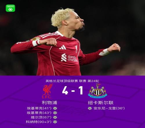 劍南春利物浦41逆轉(zhuǎn)紐卡,埃基蒂克雙響,科納特破門