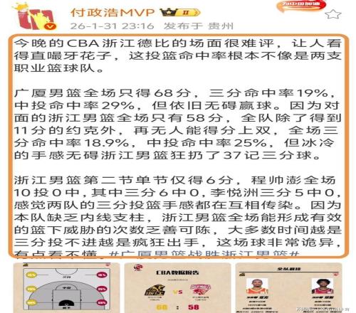 賽后,連著名體育記者付政浩也忍不住在社媒發(fā)文吐槽“今晚的CBA浙江德比的場面很難評,讓人看得直嘬牙花子,這投籃命中率根本不像是兩支職業(yè)籃球隊。廣廈男籃全場只得68分,三分命中率19%,中投命中率29%,但依舊無礙贏球。因為對面的浙江男籃全場只有58分,全隊除了得到11分的約克外,再無人能得分上雙,全場三分命中率18.9%,中投命中率25%,但冰冷的手感無礙浙江男籃狂扔了37記三分球……”。