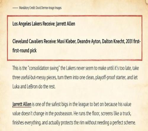 美媒《Fadeaway World》撰文提出了一套4換1的交易方案,建議湖人將克萊伯、艾頓、克內(nèi)克特以及2031年的首輪簽送到騎士,換回中鋒阿倫。