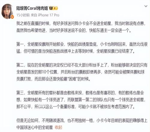 倫納德的中方經紀人烤肉姐在社媒上詳解了小卡落選全明星一事,她一早就說過小卡入選全明星有點懸。
