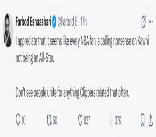 這場比賽后快船記者Fabdod再度提到倫納德落選全明星陣容一事:我很理解,似乎每一位NBA球迷都覺得小卡不入選全明星極度荒謬,很少看到人們因為快船的相關事情團結起來。