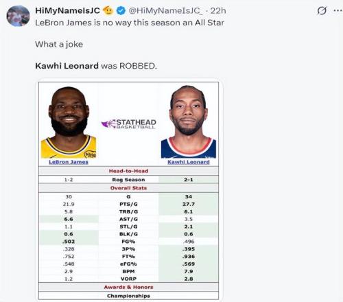 快船媒體曬出詹姆斯、倫納德的數(shù)據(jù)對比,倫納德還比詹姆斯多打4場比賽!