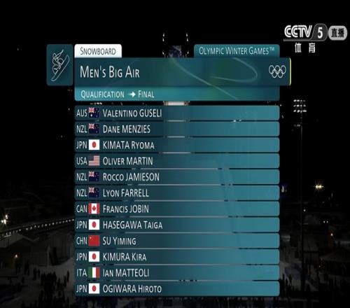 體育播報(bào)02月06日宣 米蘭冬奧會(huì)單板滑雪男子大跳臺(tái)預(yù)賽三輪全部結(jié)束,衛(wèi)冕冠軍蘇翊鳴以第4名晉級(jí)決賽。葛春宇、楊文龍遺憾無(wú)緣決賽。