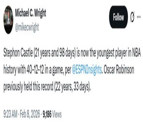 同時(shí)卡斯?fàn)柌?1歲零98天,這讓他打破此前由大O(22歲33天)保持的歷史紀(jì)錄,成為NBA歷史上單場(chǎng)拿到至少40分12板12助最年輕的球員。