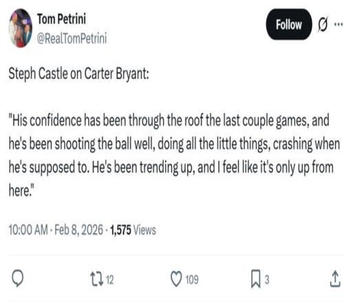 除此之外,卡斯?fàn)柗Q贊了另外一名新星卡特布萊恩特,直言自己感覺(jué)到了他在過(guò)去幾場(chǎng)比賽信心爆棚,不僅投籃手感火熱,細(xì)節(jié)也做得很到位,他的狀態(tài)一直在提升,顯然會(huì)越來(lái)越好。