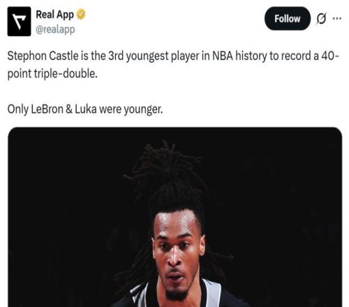 也成為NBA歷史上砍下40+三雙第三年輕的球員,僅次于詹姆斯和東契奇。