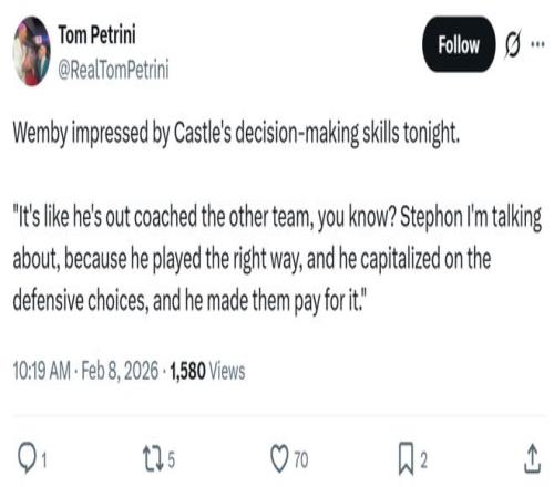賽后文班也對(duì)卡斯?fàn)柋緢?chǎng)出色的決策能力大加贊賞到:“感覺(jué)他就像教練組一樣把對(duì)方耍得團(tuán)團(tuán)轉(zhuǎn),你懂我的意思吧?卡斯?fàn)柎虻煤芎侠?,一直在作出正確的決策,抓住對(duì)手的漏洞,讓他們付出了代價(jià)?!?/p>