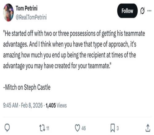 主帥米奇同樣稱贊了卡斯?fàn)柋緢?chǎng)合理的打法:“開(kāi)局前幾個(gè)回合他一直為隊(duì)友創(chuàng)造機(jī)會(huì),我覺(jué)得當(dāng)你一直采取這種打法時(shí),就會(huì)驚訝的發(fā)現(xiàn),你反而會(huì)成為自己為隊(duì)友創(chuàng)造的優(yōu)勢(shì)的受益者。”