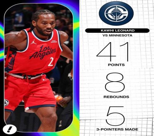 這場比賽,倫納德又一次交出了炸裂表現:全場出戰(zhàn)33分鐘,投籃30中14,三分11中5,罰球10中8,拿下41分8籃板2助攻4搶斷,在場正負值高達+20。