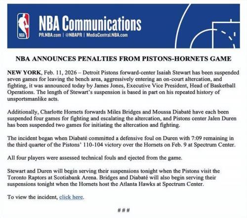此前,NBA官方還公布了另一張重磅罰單,對黃蜂vs活塞四人驅(qū)逐的大沖突進行處罰——