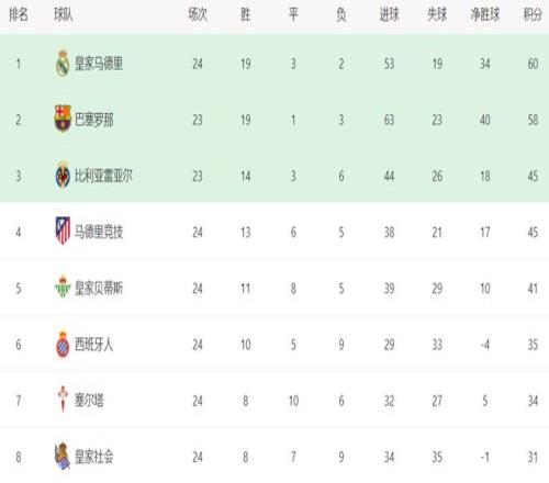 在積分榜上,皇馬以60分排名榜首?;蜀R的戰(zhàn)績(jī)是19勝3平2負(fù)。巴薩則以58分屈居第2名。不過(guò),巴薩比皇馬少踢1輪,接下來(lái)有機(jī)會(huì)重登榜首。比利亞雷亞爾45分排名第3。馬競(jìng)慘敗之后,依然是45分,但凈勝球比比利亞雷亞爾少,跌到了第4名。皇家貝蒂斯贏球后,總積分是41分,繼續(xù)縮小與身前球隊(duì)的差距,排名第5,距離歐冠區(qū)越來(lái)越近。西班牙人拿到35分,排名第6。