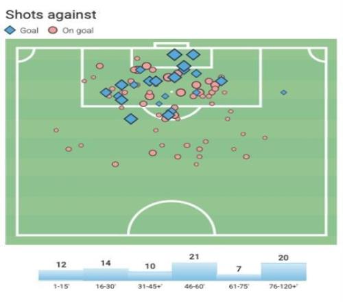如果現(xiàn)在再回看迪亞斯的參與進(jìn)球和參與制造得分機(jī)會(huì)完整點(diǎn)位圖,你會(huì)發(fā)現(xiàn),迪亞斯最有威脅的時(shí)間主要集中在下半場(chǎng)前半段和后半段,這兩個(gè)足球比賽尤為關(guān)鍵的時(shí)期。本賽季,拜仁在落后或膠著的比賽中,迪亞斯貢獻(xiàn)7球4助,獨(dú)造11球,占球隊(duì)膠著局進(jìn)球數(shù)的42%。迪亞斯的所有數(shù)據(jù),都是在全德甲所有球員壓力值最大的情況下取得的,即便這樣他也竟然也值是本賽季德甲場(chǎng)均評(píng)分第二的左邊鋒,但所有數(shù)據(jù)都能證明迪亞斯有一顆大心臟。