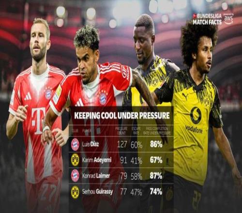 第一輪國家德比前,德甲官方數(shù)據(jù)AWS就曾強(qiáng)調(diào)指出:路易斯·迪亞斯在壓力下極為冷靜。在本賽季的127次壓迫情境中,迪亞斯成功擺脫了其中的60%。更令人印象深刻的是,在壓迫下,這位哥倫比亞人的傳球成功率高達(dá)86%(數(shù)據(jù)截止2025年10月17日)。