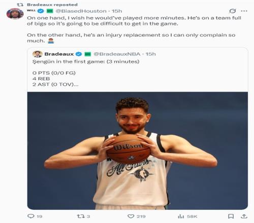 休媒Will發(fā)聲:一方面我希望他能上更多的場次。他所在的球隊中有多位內(nèi)線球員,所以他要進入主力輪換會很困難。另一方面他只是替補球員,所以我只能抱怨他的戲份太少。