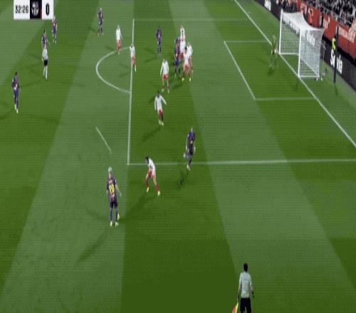 第28分鐘,巴薩前場(chǎng)搶斷,拉菲尼亞面對(duì)三人防守,一腳怒射,皮球稍稍高出。
