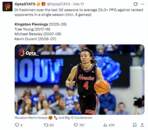 北京時(shí)間2月17日,休斯頓大學(xué)67-70惜敗愛(ài)荷華州立大學(xué),這場(chǎng)比賽弗萊明斯37分鐘,15中9,三分6中4,拿到22分5籃板4助攻,命中率60%,三分命中率66.7%。這位19歲的控衛(wèi)三分射術(shù)非常精湛。