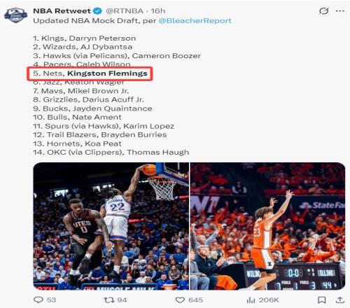 根據(jù)美媒《露天看臺(tái)》的選秀預(yù)測(cè),弗萊明斯的確是第五順位,而他們則預(yù)測(cè)籃網(wǎng)抽中第五順位,籃網(wǎng)選中這位身高1.93米的頂級(jí)控球后衛(wèi)。