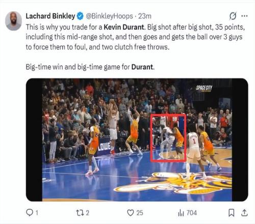 火箭隊記蘭德里-賓克利:這就是斯通換來KD的原因!一次次的精彩中距離,他拿到35分包括全場最關(guān)鍵的一個突破三人防守的急停,最后時刻接球造犯規(guī)兩罰全中。對于杜蘭特來說這是重大意義的勝利。