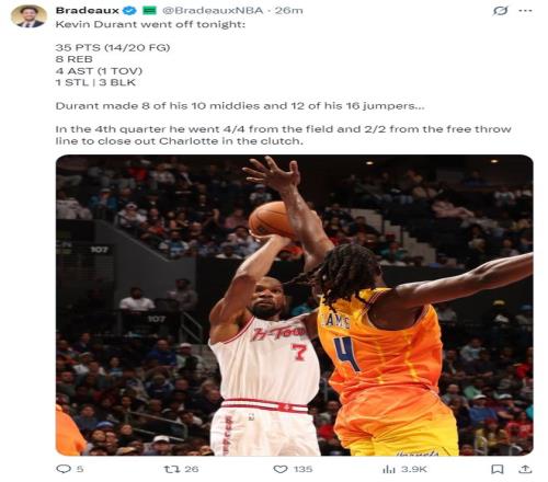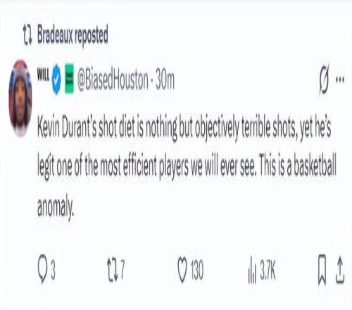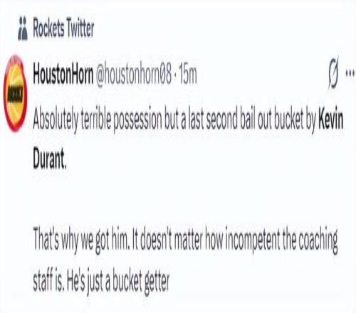 休媒:說實話我們打出了一場極其糟糕的比賽,但杜蘭特在最后一刻一人扛起火箭為球隊挽回顏面,這就是我們交易他的原因,無論教練組多么無能,他都能穩(wěn)定輸出。