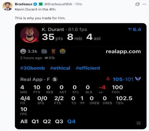 杜蘭特的第四節(jié)4分鐘,4中4,罰球2中2拿到10分,這就是我們交易他來的關(guān)鍵原因。