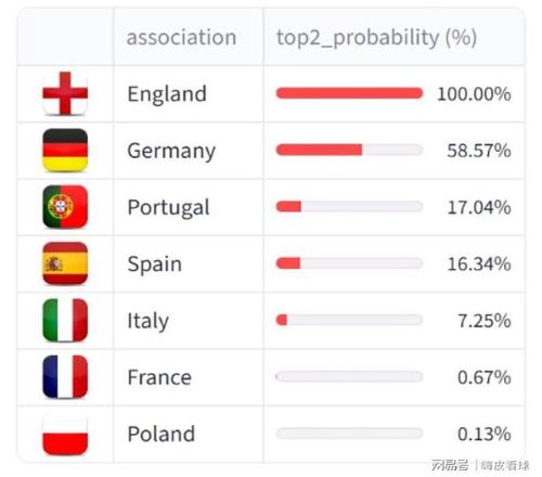 根據(jù)專業(yè)足球數(shù)據(jù)機(jī)構(gòu)Football Meets Data的分析,英超已經(jīng)百分百確定前兩名,德甲獲得另外一個(gè)獎(jiǎng)勵(lì)名額的機(jī)會(huì)也超過五成。目前,德甲只有法蘭克福在歐冠出局,拜仁慕尼黑、弗賴堡和美因茨均直通16強(qiáng),勒沃庫森、多特蒙德和斯圖加特附加賽首回合均至少手握兩球優(yōu)勢(shì),因此保住第二名的希望是很高的。