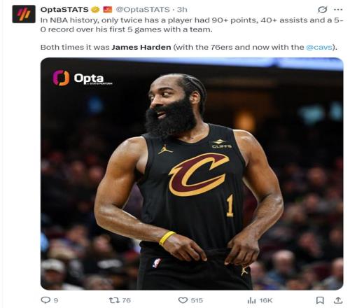 根據(jù)數(shù)據(jù)媒體的統(tǒng)計(jì),一名球員換隊(duì)后的前五場(chǎng)比賽,能得到90分以上、助攻數(shù)超過(guò)40次以上且球隊(duì)?wèi)?zhàn)績(jī)5勝0負(fù)的球員只有詹姆斯-哈登,NBA歷史上出現(xiàn)了兩次都是哈登,上一次是出現(xiàn)在費(fèi)城76人。