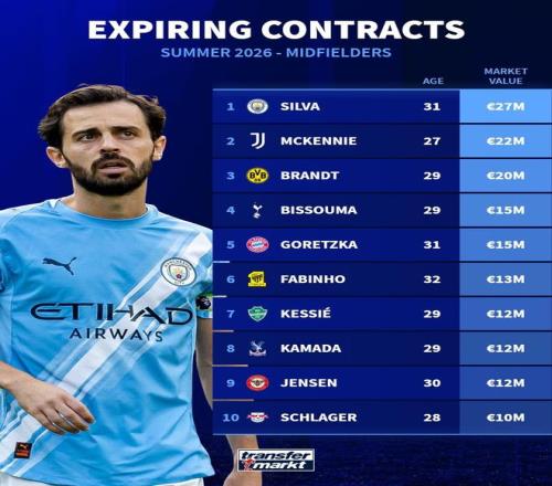 德國(guó)轉(zhuǎn)會(huì)市場(chǎng)統(tǒng)計(jì)了今夏合同到期的十大中場(chǎng),其中球員按照身價(jià)從高到低排序。