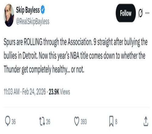 名嘴Skip則表示馬刺隊(duì)勢(shì)如破竹,不僅拿下9連勝,還擊敗了聯(lián)盟第一活塞,現(xiàn)在壓力給到雷霆隊(duì),能否保持健康將決定本賽季NBA冠軍的歸屬。