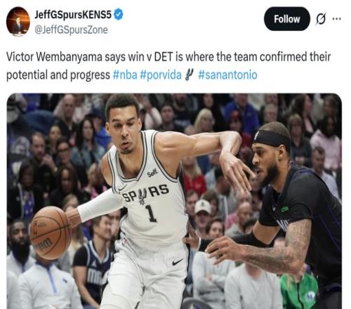 文班則認(rèn)為本場(chǎng)擊敗聯(lián)盟第一活塞是團(tuán)隊(duì)的勝利,每個(gè)人都在這場(chǎng)比賽中有所貢獻(xiàn),同時(shí)本場(chǎng)勝利是馬刺證明自身實(shí)力和取得進(jìn)步的重要時(shí)刻。