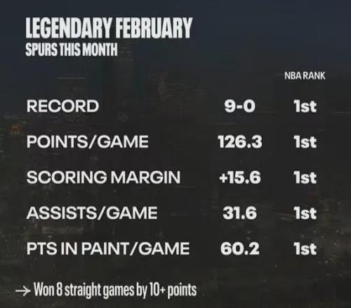 馬刺當(dāng)前勢頭極佳,今年二月份至今未嘗敗績,9勝0負(fù),并且場均得分(126.3)、場均凈勝分(15.6)、場均助攻數(shù)(31.6)、場均禁區(qū)得分(60.2)均高居聯(lián)盟榜首,對于他們而言一切皆有可能。