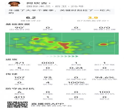 阿坎吉本場(chǎng)數(shù)據(jù):3射1正,1次中框,6次解圍,5次對(duì)抗僅1次成功