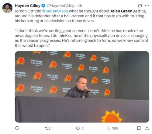 賽后太陽(yáng)主帥喬丹-奧特談到杰倫-格林減少了突破大多數(shù)都選擇投籃,他表示:格林在進(jìn)攻選擇時(shí)跟此前發(fā)生了一些變化,他的腿筋正在逐漸痊愈,我們一早就預(yù)料到這種結(jié)果。